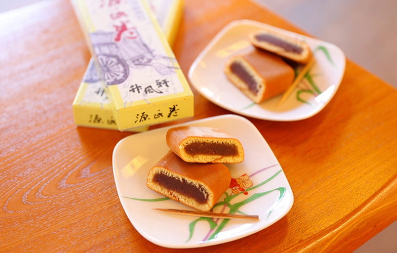 上品な味でオススメです。試食もあります!源氏巻き、かりんとう、お茶 -